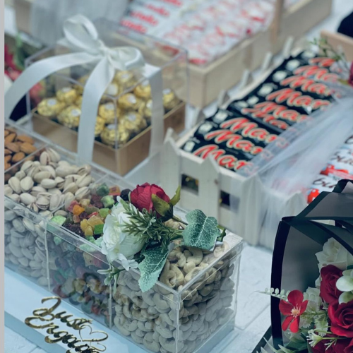 From luxuries chocolates to handpicked nuts , every deatil of this setup adds charm to your event . whether it s an engagement or a wedding , a well curated snack station leaves a lasting impression . add floral accents and personalized touches to turn a simple table in to showstopper